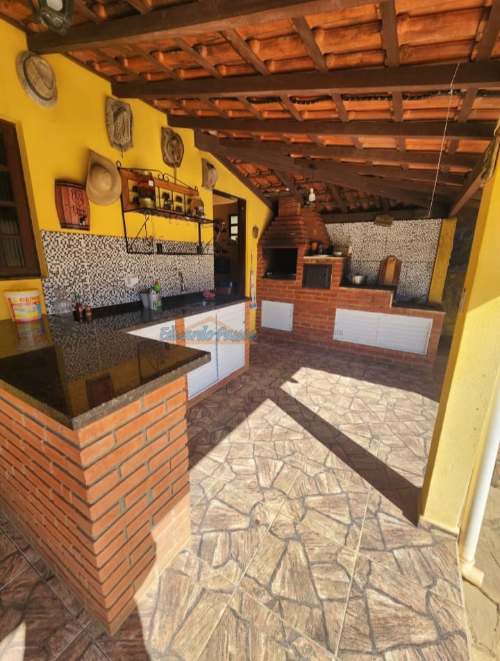 Área gourmet completa, com fogão de lenha com forno, churrasqueira e salão.